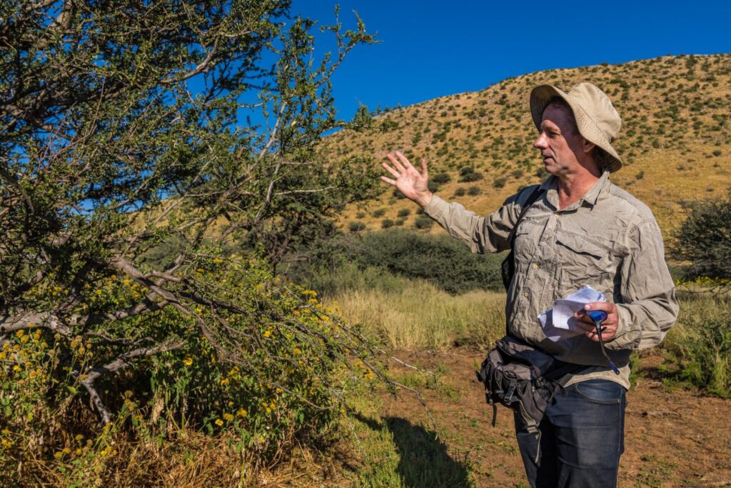 Over the years, Terblanche has compiled an astonishing checklist of 83 butterfly species at Tswalu, discovered possible new taxa, and documented life histories of Acraea species previously unknown. He has applied quantitative counting methods discussed at global butterfly monitoring workshops, conducted vegetation studies to understand landscape ecology, and compiled an authoritative list of host-plant species that sustain these populations.